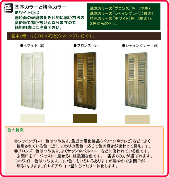 詳細を見る ↓ 【【【基本機能】】】 1.ルーバー脱着機能 ■脱着可能式ルーバー ■取外簡単で水洗いOK! 2. 通風調節機能 ■風調節可動ルーバー ■プライバシー保護 3. 防犯機能 ■内外カギ付き ■上下2点式のロック 4. 防虫ネット機能 ■取り外し可能式アミド ■張り替え簡単 5. 大型ポスト機能 ■郵便受、左右2ヶ所付 ■取手を兼ねた郵便受 6.V型開閉機能 ■本体、ラクラク開閉 ■本体、上部吊りコマ式 7. 高さ調整機能 ■5cmアジャスト材付 ■色々なドアに対応可 ※1〜7は標準装備 8.基本カラー ■3色から選べるカラー 【【【オプション機能】】】 9.バリアフリー機能 ■下枠が脱着可能式 ※アミドの使用時は 取り外しできません 10.フィルター機能 ■専用防塵フィルター |