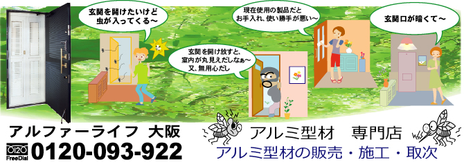 玄関網戸をはじめとしたアルミサッシ関連商品の取次、設計、企画、施工、一般販売、卸し販売、各社外注工事施工など販売から取り付けまでの業務を行っています。玄関網戸のアミド専門アルファーライフ